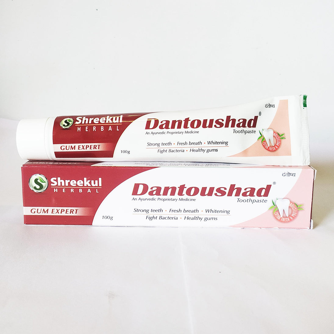 Shreekul Herbal Dantoushad Toothpaste is a natural Ayurvedic dental care solution enriched with Neem, Babool, Miswak, Clove, Aloe Vera & Vajradanti. It provides complete oral protection by reducing gum problems, tooth sensitivity, and plaque buildup.