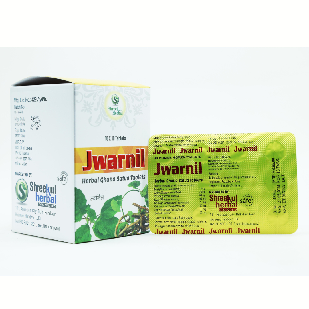 Jwarnil Tablets is a powerful Ayurvedic formulation designed to fight fevers, infections, and chronic weakness naturally. Enriched with a blend of potent herbs like Tulsi, Giloy, Chirata,