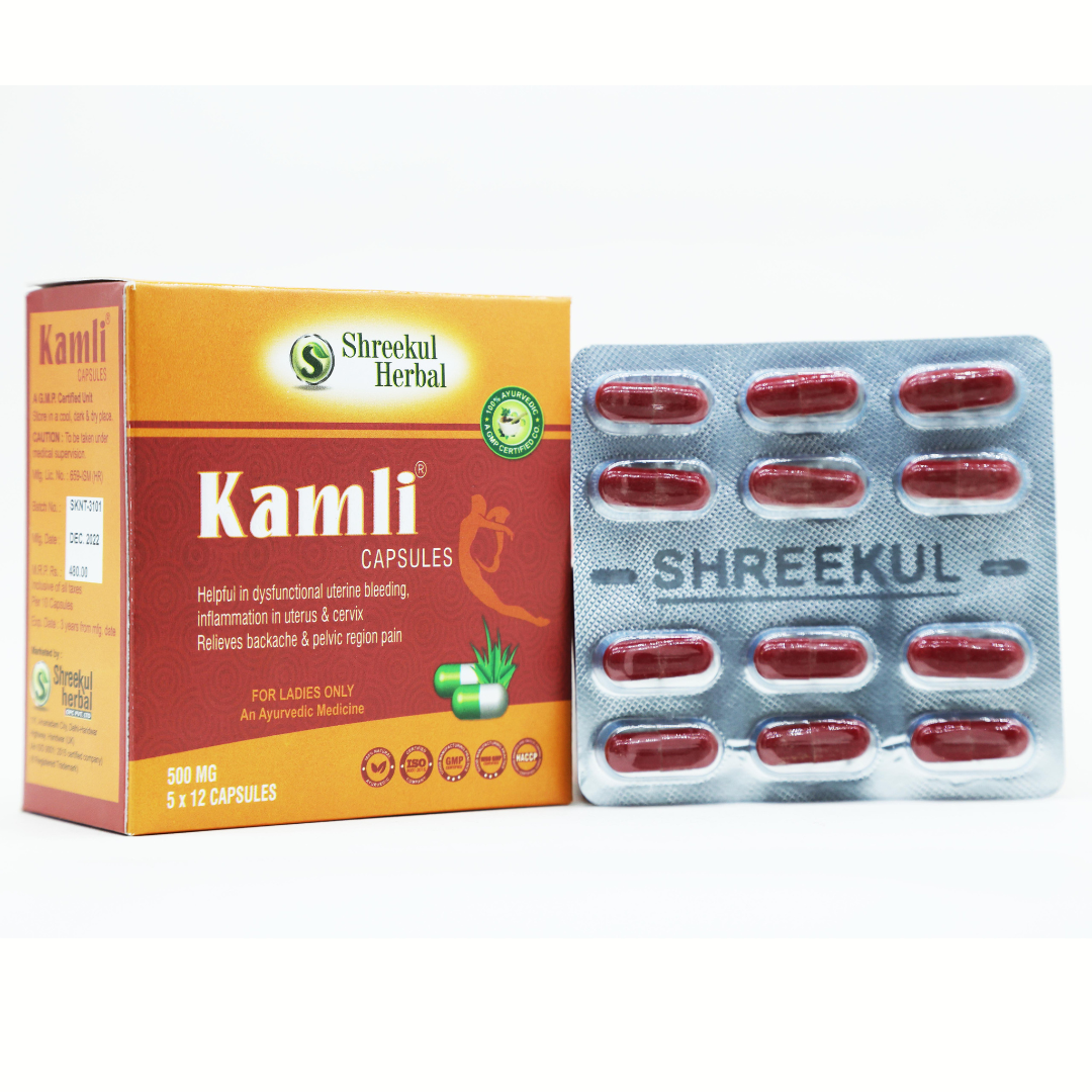 Kamli Capsules by Shreekul Herbal are specially formulated Ayurvedic capsules designed to support women’s health and well-being. Enriched with powerful herbal extracts like Ashoka, Shatavari, Lodhra, Mulethi, and mineral bhasmas, Kamli Capsules help in managing menstrual disorders and gynecological issues naturally.
