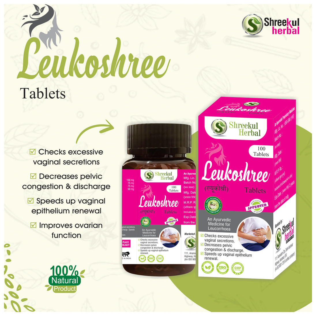 Leukoshree Herbal Tablets are an effective Ayurvedic formulation designed to support women’s reproductive health and well-being. Made with potent herbal extracts including Lodhrasal, Karanjsal, Daruharidra, and Ashoksal, this natural remedy provides relief from excessive vaginal secretions and helps in maintaining healthy vaginal flora.