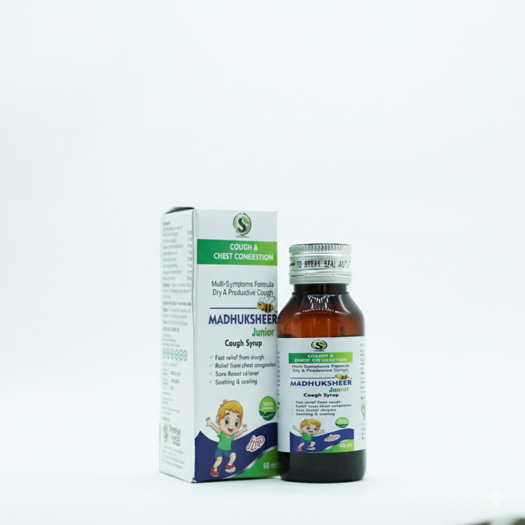 Madhuksheer Junior Cough Syrup bachchon ke liye specially banaya gaya ek herbal (ayurvedic) cough syrup hai, jo dry cough, chest congestion, aur irritating cough me fast relief deta hai. Yeh multi-symptom formula natural herbs se bana hai, jo cough ko control karne ke saath throat ko soothe (shant) bhi karta hai.