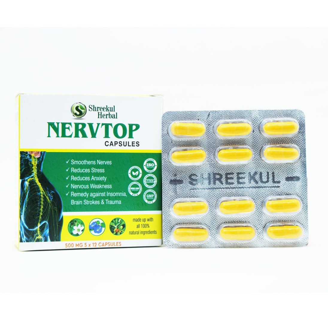 Shreekul Herbal Nervtop Capsules are a premium Ayurvedic solution designed to calm the mind, strengthen the nervous system, and promote overall mental well-being. Formulated with a blend of 10 powerful herbs and minerals, including Ashwagandha, Brahmi, Shankhpushpi, Jyotismati, and Shilajit, this herbal supplement helps reduce stress, anxiety, and nervous weakness.