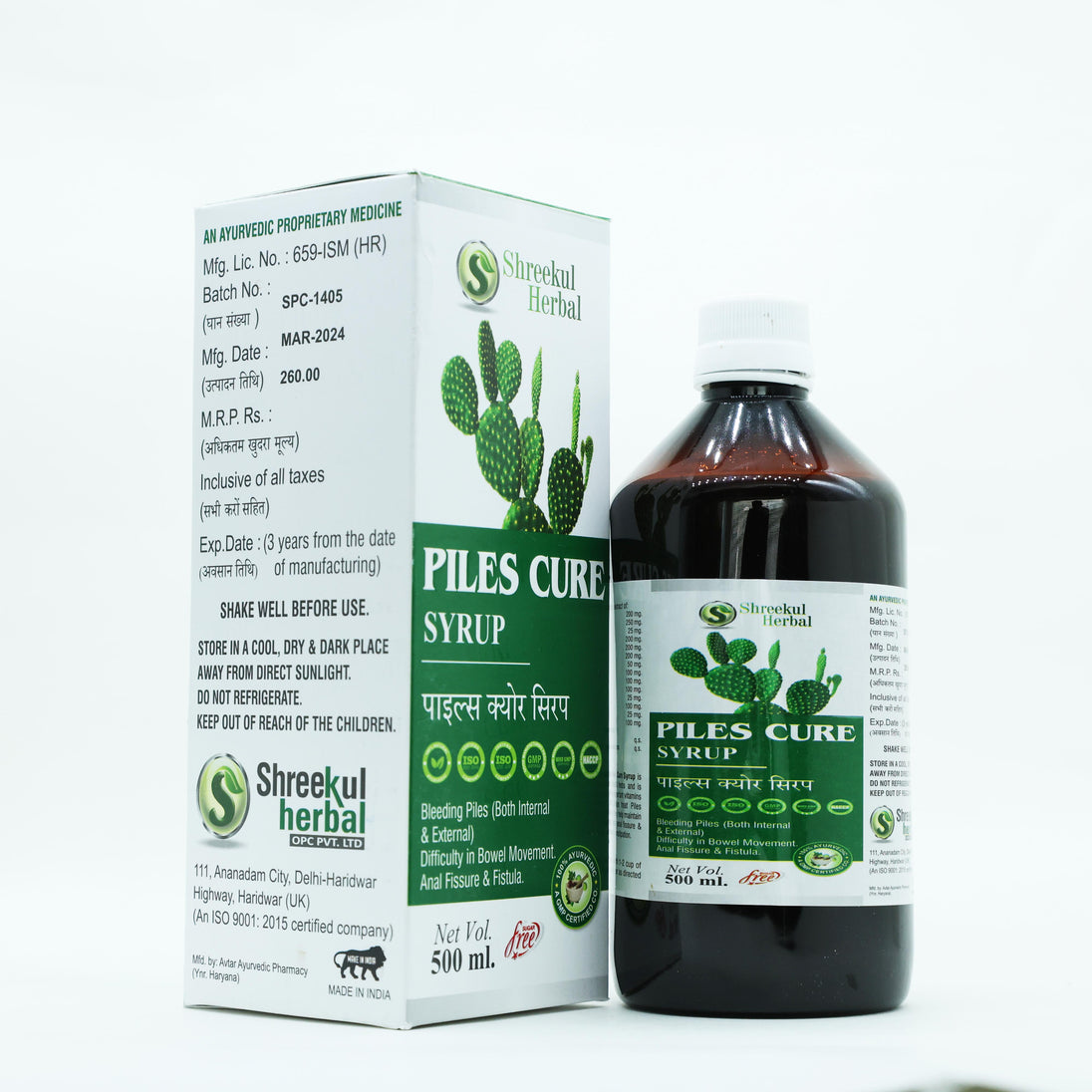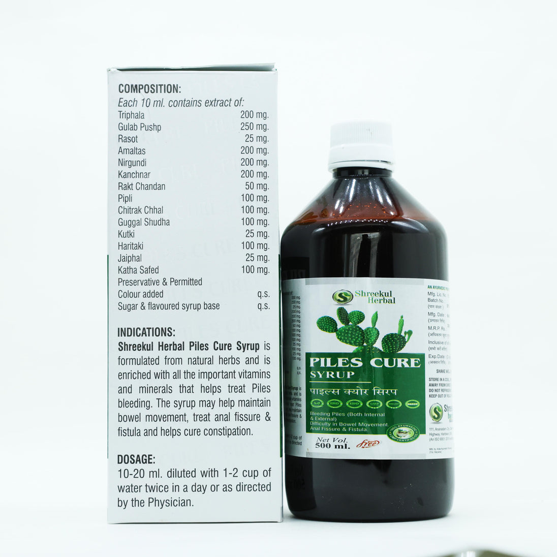 Shreekul Herbal Piles Cure Syrup is a natural Ayurvedic formulation designed to provide relief from piles, fissures, and related bowel discomfort. Enriched with a unique blend of herbs such as Triphala, Gulab Pushp, Amaltas, Nirgundi, and Kanchanar, this syrup works effectively to reduce swelling, control bleeding, and ease painful bowel movements.