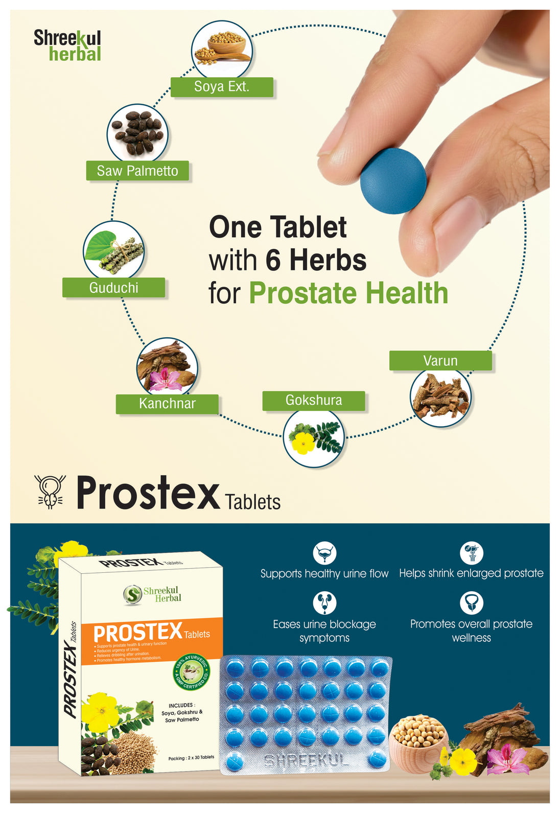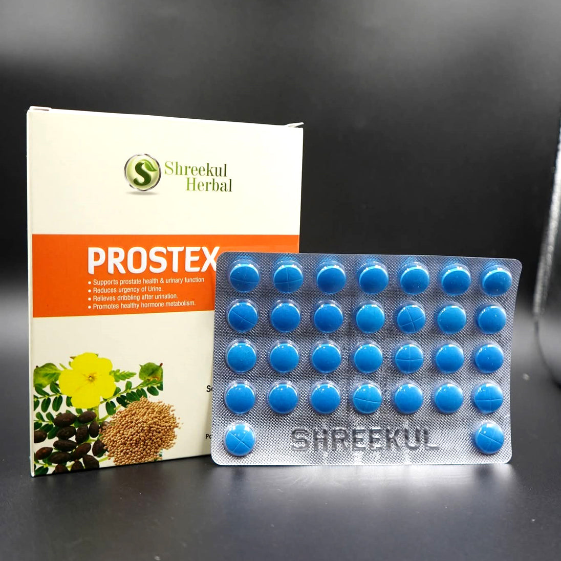 Shreekul Herbal Prostex Tablets are a natural Ayurvedic formulation specially designed to support prostate health and improve urinary function. Enriched with potent herbs such as Saw Palmetto, Soya Extract, Guduchi, and Varun, this blend provides comprehensive relief from common prostate and urinary issues.