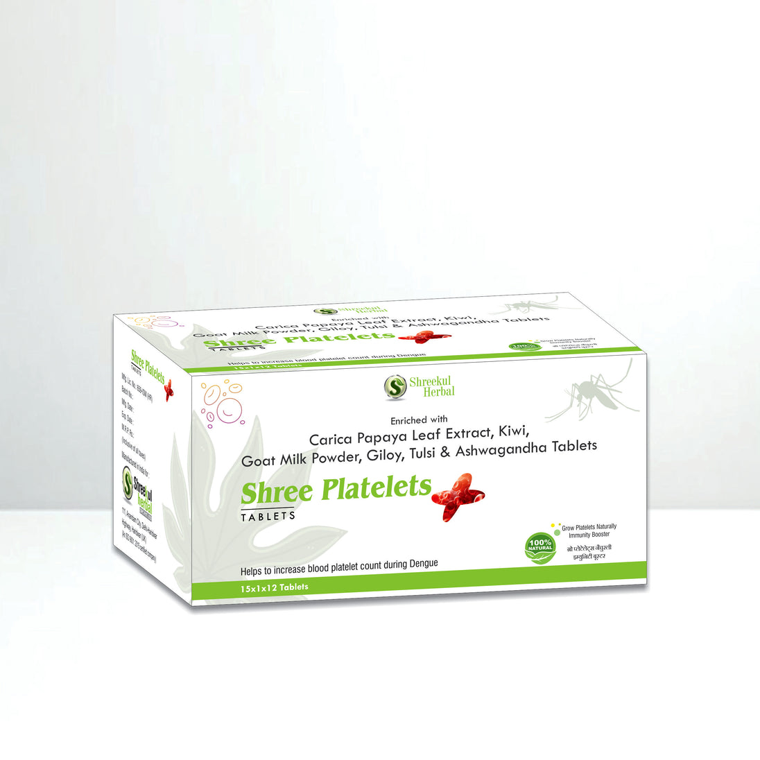 Shree Platelet Tablets is a premium Ayurvedic formulation designed to help maintain a healthy platelet count and strengthen the immune system. Rich in Carica Papaya Leaf Extract (1100 mg per tablet), this herbal supplement is especially beneficial in managing platelet reduction caused by infections like dengue, malaria, and viral fevers.