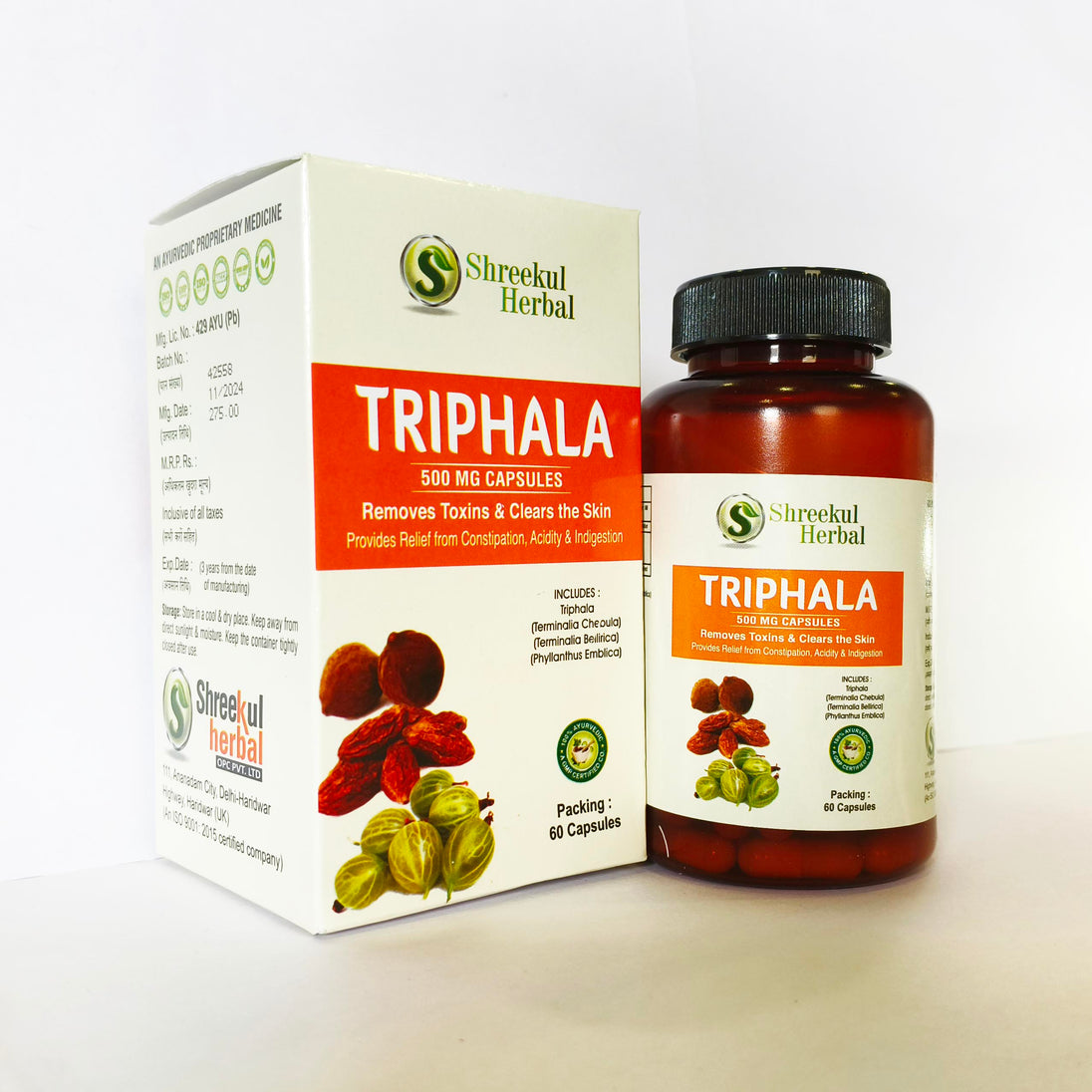 Shreeakal Herbal Triphala Capsules are a natural Ayurvedic supplement formulated with the perfect blend of three rejuvenating fruits – Amla (Emblica officinalis), Harad (Terminalia chebula), and Bahera (Terminalia belerica). Each capsule delivers 500 mg of pure herbal extracts, providing powerful digestive, detoxifying, and rejuvenating benefits.