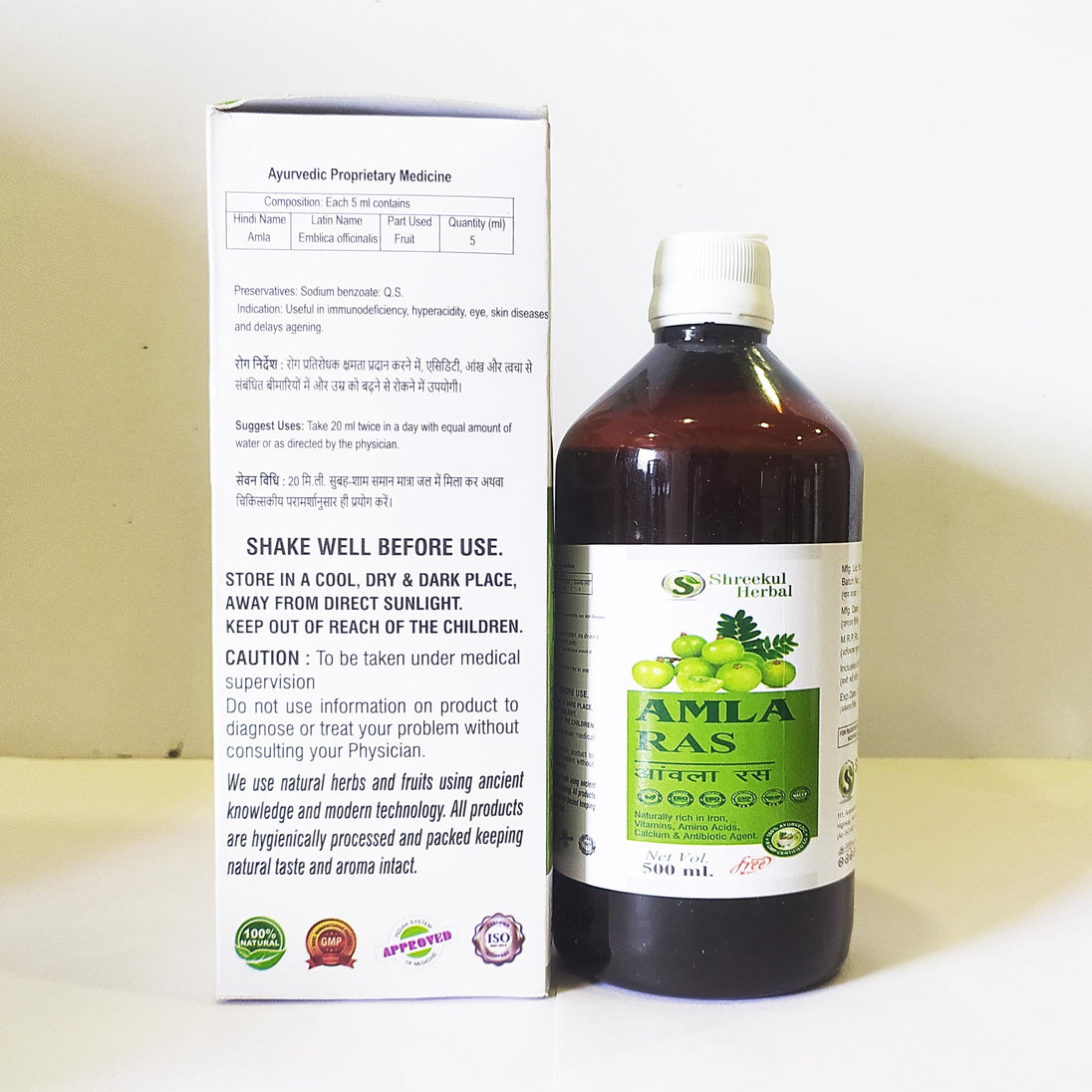Shreekul Herbal Amla Ras is an Ayurvedic herbal juice preparation made from Amla, as indicated on the packaging. It is presented in liquid form and prepared following traditional Ayurvedic principles.