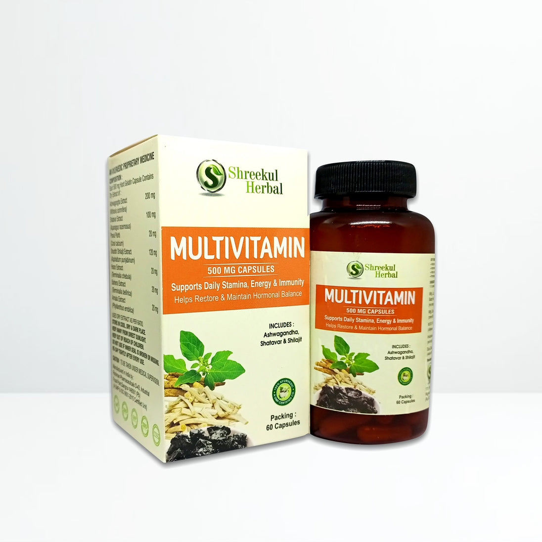 ShreeKul Herbal Multivitamin Capsules are a powerful blend of essential Ayurvedic herbs formulated to boost energy, immunity, and overall wellness. Enriched with Ashwagandha, Shatavari, Shilajit, Amla, and other revitalizing herbs, this supplement supports daily stamina, strengthens bones, and helps the body combat fatigue and stress.