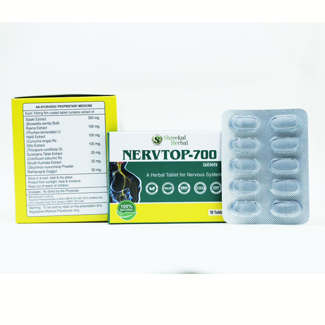Shreekul Herbal Nervtop-700 Tablets are a herbal formulation designed for nervous system support. The product is made using a blend of traditional herbal extracts as listed on the packaging.