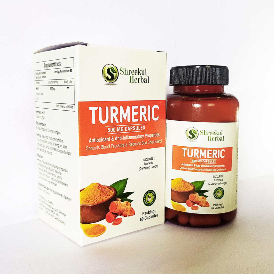 Shreekul Herbal Turmeric Capsules are an Ayurvedic herbal formulation presented in capsule form for convenient daily use. Each capsule contains 500 mg of Turmeric, as clearly stated on the packaging.