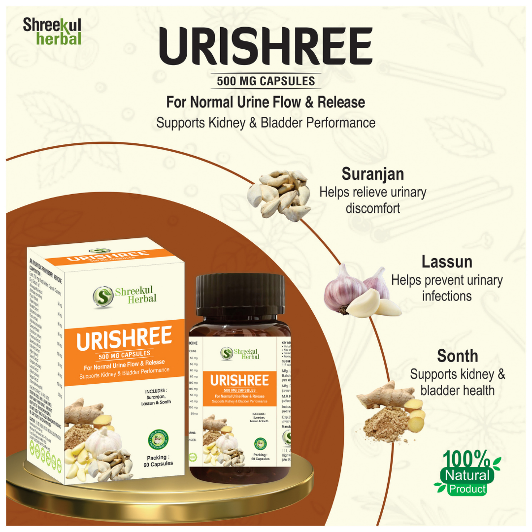 Urishree Capsules ek Ayurvedic herbal formula hai jo normal urine flow, urinary discomfort aur kidney–bladder health ko support karta hai. Ye capsules un logon ke liye specially banayi gayi hain jo urine related problems, jalan, ruk-ruk kar peshab ya bladder weakness se pareshan rehte hain.